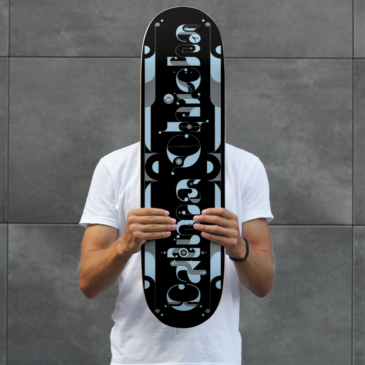 Design of boards and posters for Calma Chicha Skaters Collective. For the new decks and publications of this small skateboard brand we created experimental lettering for the graphics. On a black background the letters are printed in silver and blue that transmits innovation as well as elegance, all based on the underground culture of graffity or street culture.