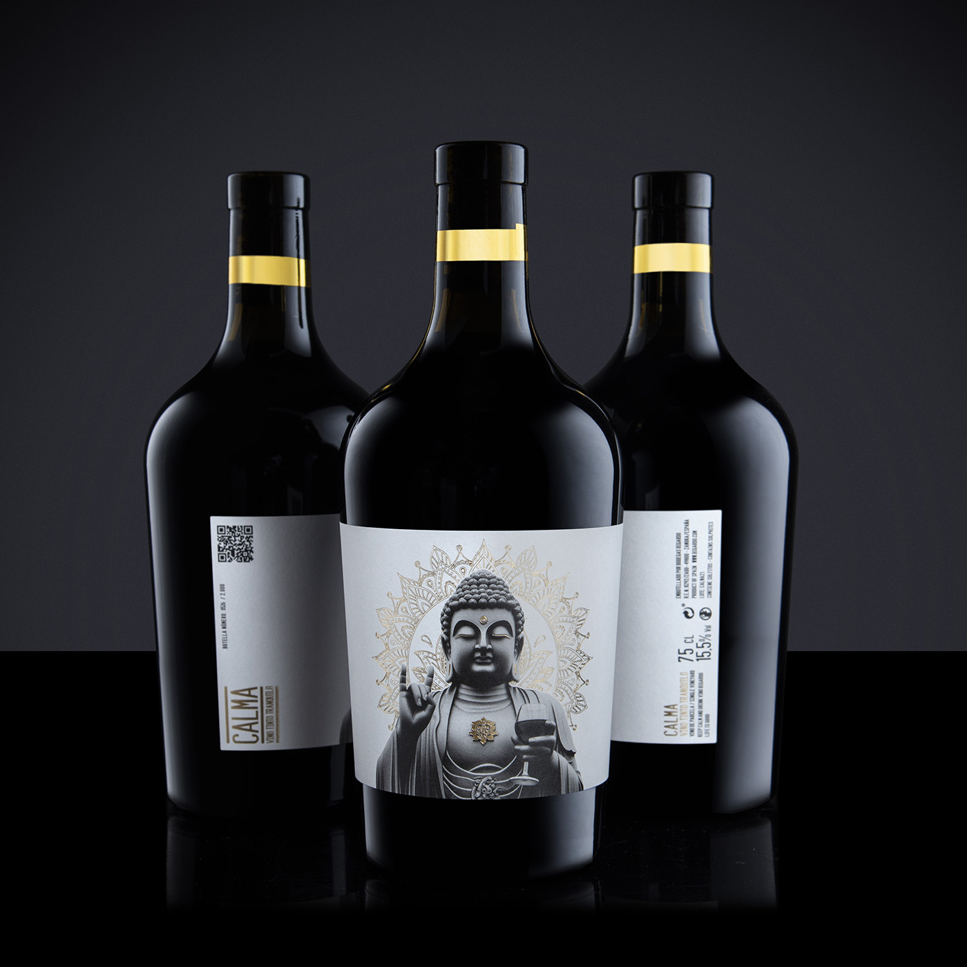 Packaging design for Bodegas Bigardo's new wine, Calma. In the meeting with the client he told us that it was a "calm" wine, hence its name. For the label we created an image of a Buddha, a symbol of peace and tranquility, making the gesture of the horns (logo and image of the winery) and behind it a gold mandala to enhance the idea of tranquility. On the collar there is a gold stamping ribbon to match all the wines in the winery.