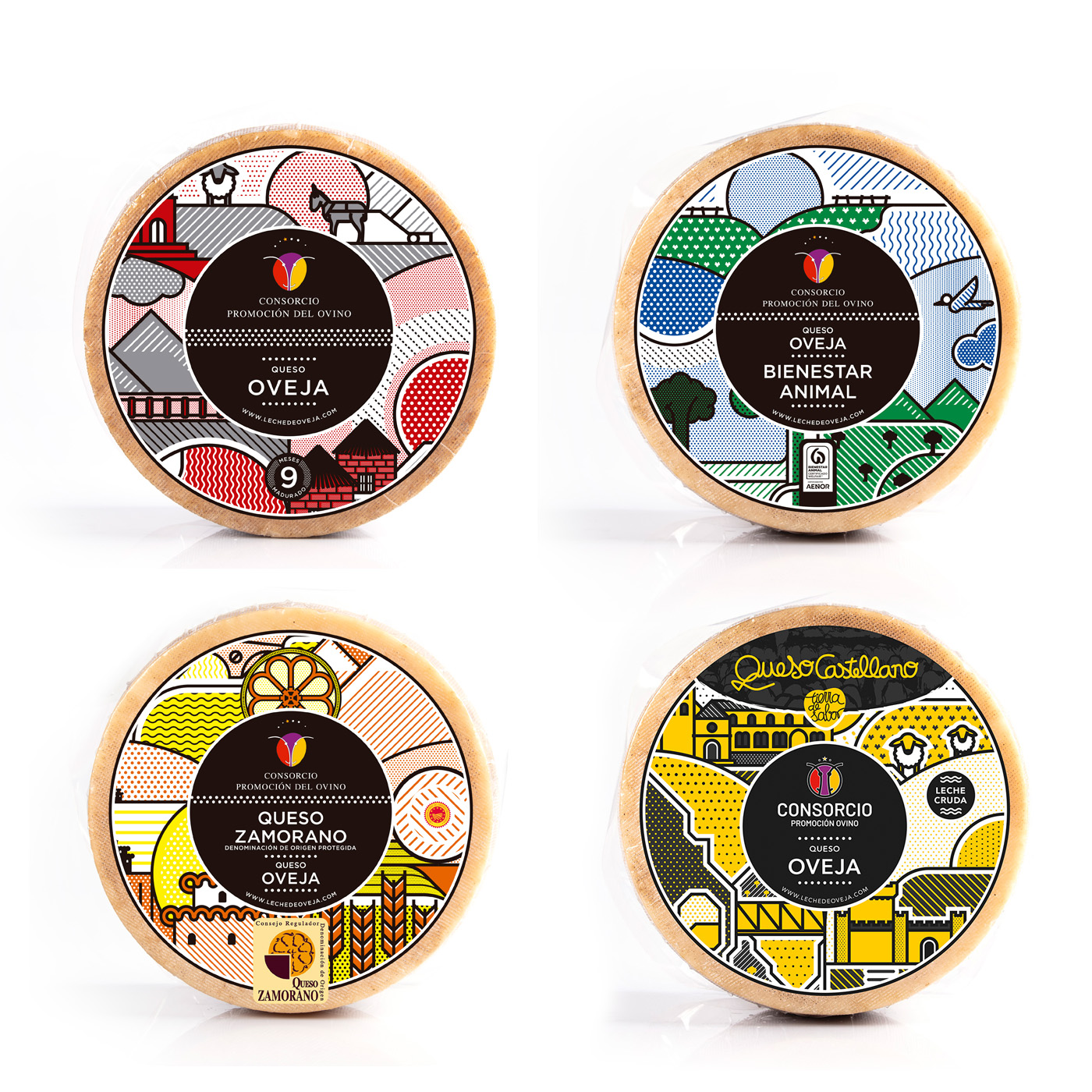 Etiquetado y packaging para los nuevos quesos de Consorcio Promoción de Ovino. En el briefing destacaron que querían una imagen moderna que pudiera atraer a los jóvenes a comprar queso de leche cruda de oveja. Para ello creamos unas ilustraciones donde se pueden ver elementos del campo de la provincia de Zamora diferenciando tanto por color como por ilustraciones los distintos quesos.