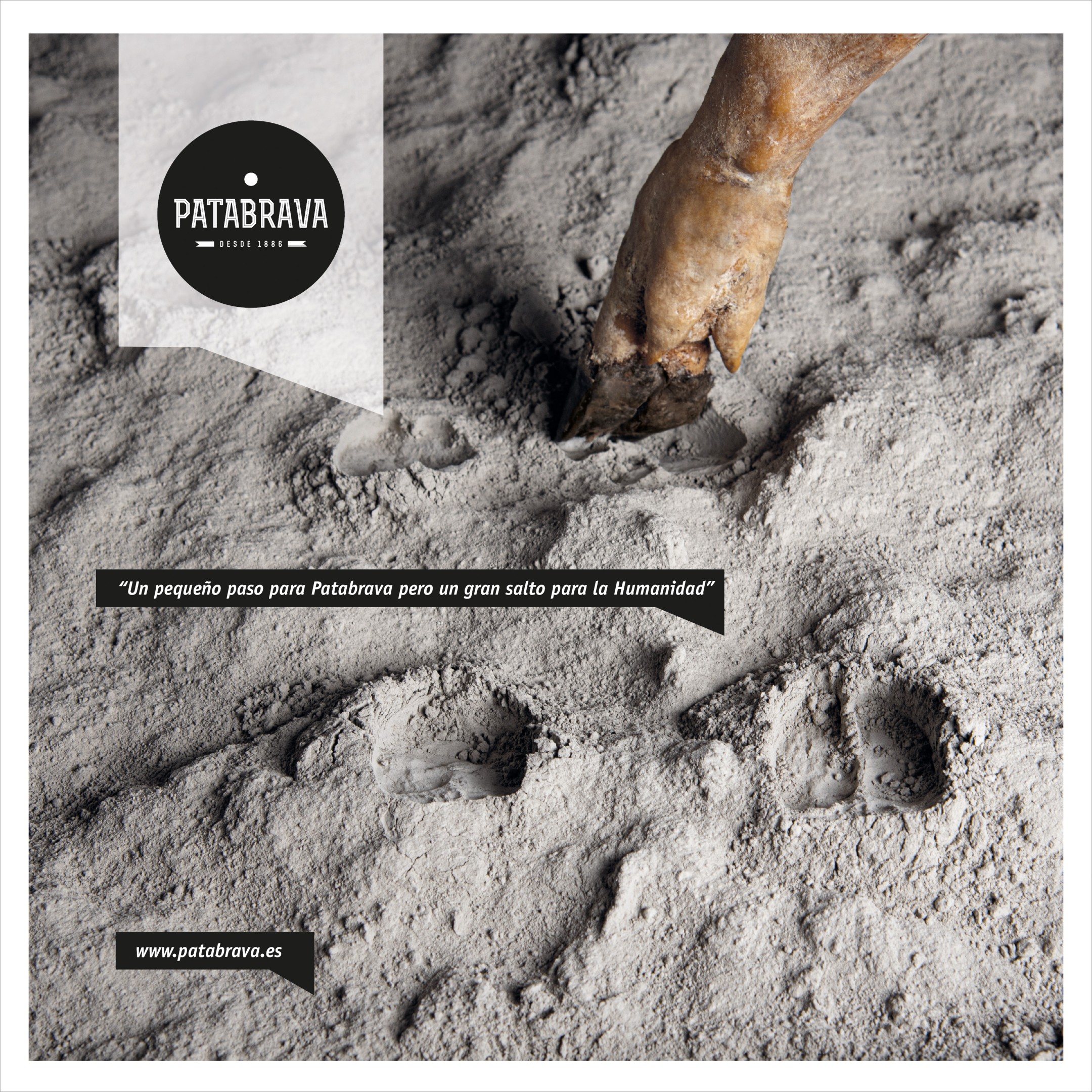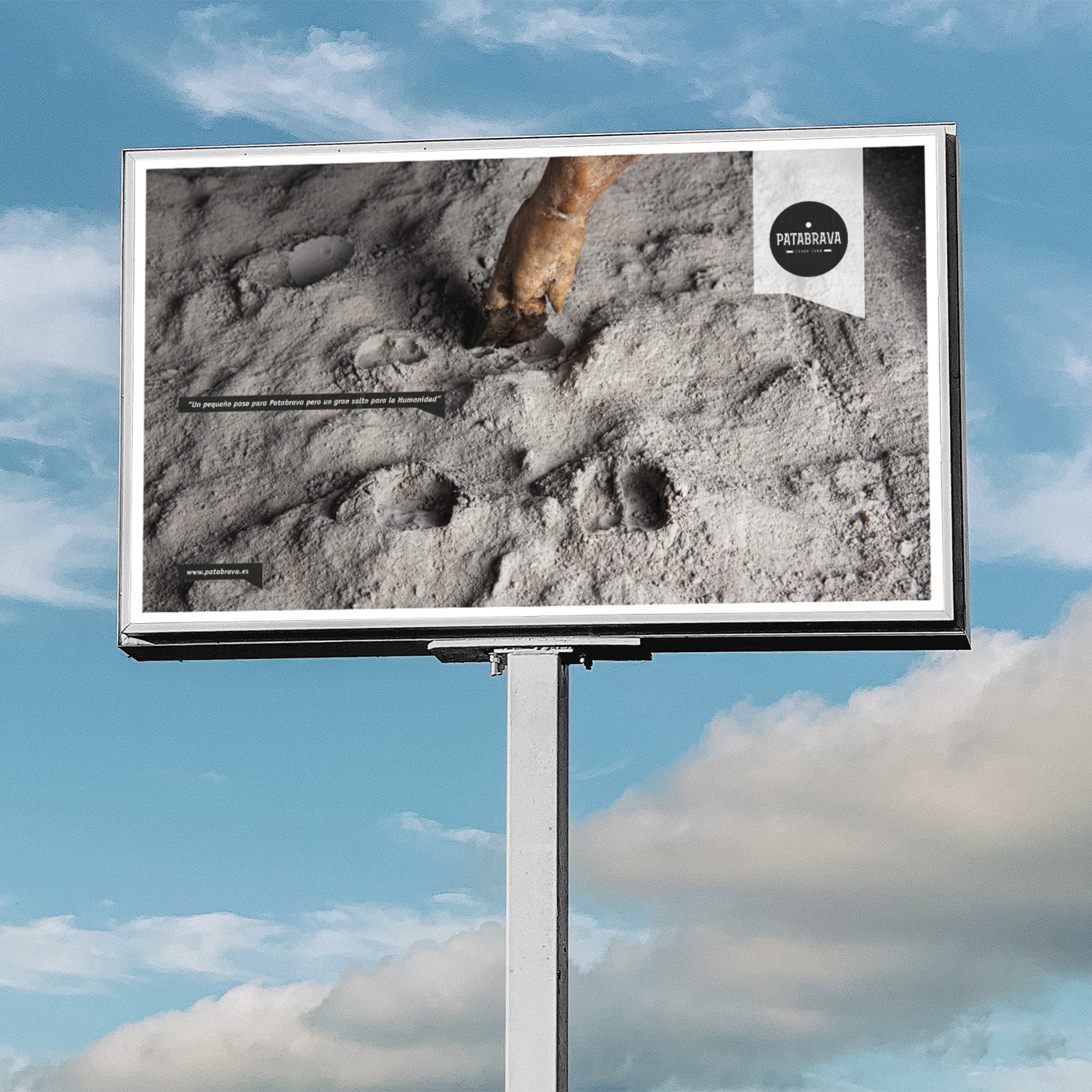 Nueva campaña para Patabrava Guijuelo, en esta ocasión hacemos una parodia de la famosa foto y la frase de Neil Armstrong cuando pisó la Luna. Para nosotros el primer animal en pisar la Luna fue el cerdo ibérico y fue un pequeño paso para Patabrava pero un paso enorme para la humanidad. Seguimos la estela de otras campañas donde el humor, la sátira y la metáfora se apodera del consumidor provocándole una sonrisa y quitando seriedad a un producto que parece estar sólo destinado al público gourmet y de esta manera lo acerca a cualquier tipo de consumidor.
