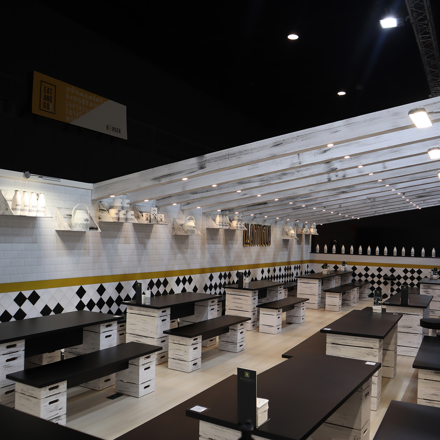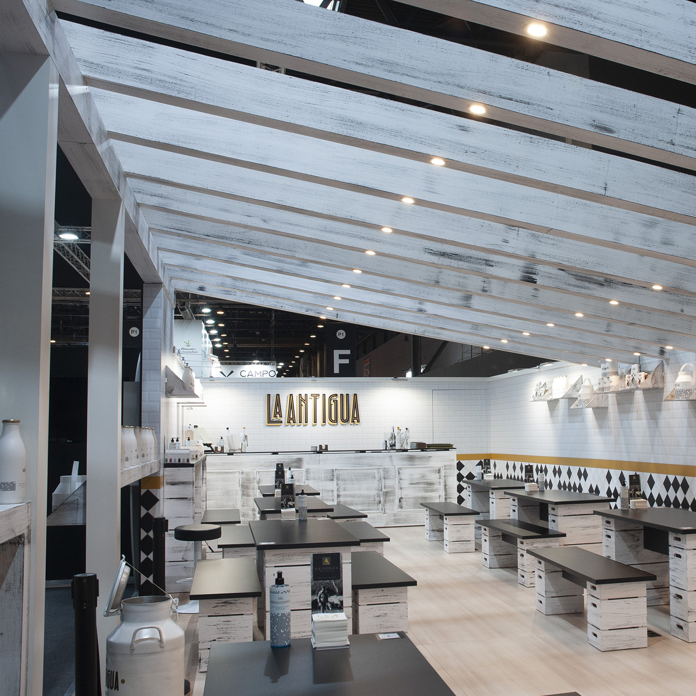 Stand design for Quesería La Antigua de Fuentesaúco in Alimentaria Premium. Under the concept of returning to the origins, we decided to focus the entire project on creating a dairy from the 50s and 60s. A space in black and white tile with all the details that these stores had, wooden boxes to display their products as well as some beams on the ceiling, all painted by hand to give it the vintage look that the project called for. In this stand, the SUMMUM 2022 products were presented, which, like the whole set, was focused on transporting us to the 50s, the packaging evokes the products that were in them, a milk container that contains a whole cheese or portions inside, some cans like those of condensed milk or milk bottles that were used to decorate this space that was a complete success due to its acceptance.